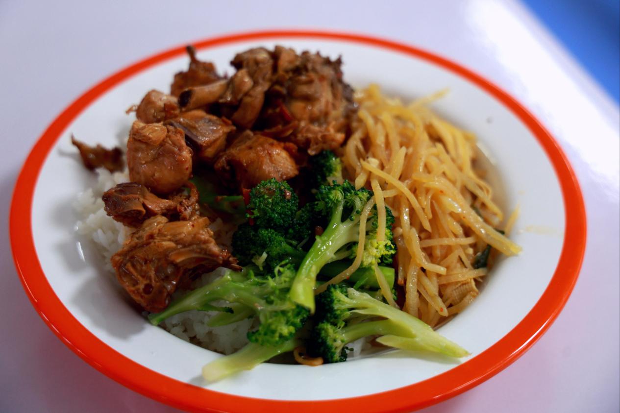 元气烧鸡饭:太香了!鸡肉鲜嫩多汁,味道浓郁,搭配西兰花和土豆丝,性价比超高!(位置:第一餐厅一楼8号窗口)
