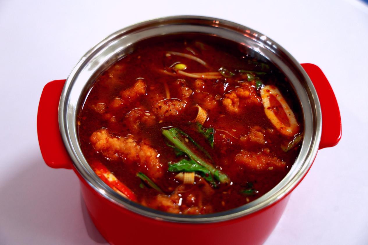 酥肉小锅:这浸满汤汁的酥肉,搭配蔬菜和蟹排,麻辣鲜香简直太好吃了。(位置:第一餐厅一楼6号窗口)