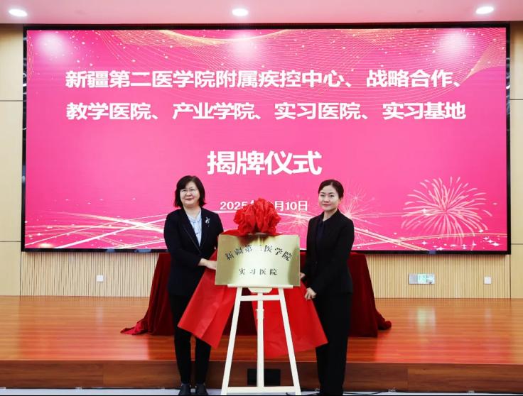 徐培兰与阿勒泰地区疾控中心、克拉玛依市卫生健康委员会、扬州市广陵区汤汪街道社区卫生服务中心代表揭牌实习基地。