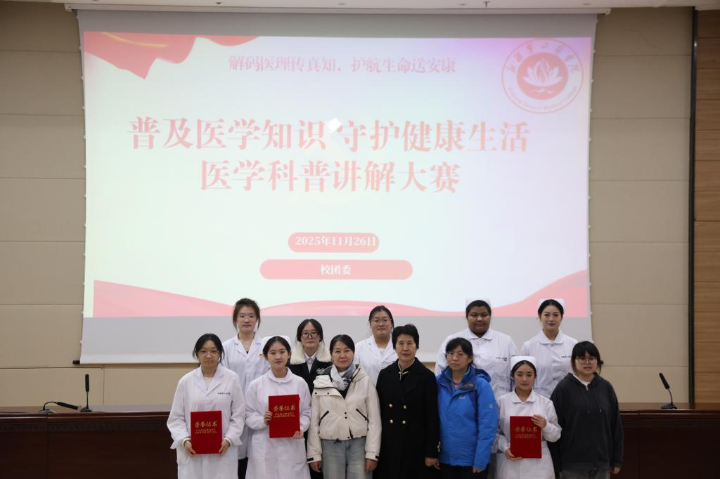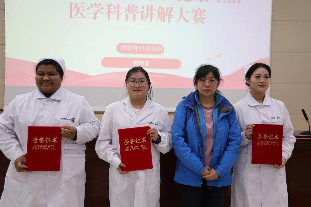 决赛现场,参赛选手灵活运用PPT演示、实物模型、视频短片等多元展示形式,以生动贴切的比喻、真实鲜活的案例拆解专业医学知识。评委结合选手现场综合表现,依据科学性、表达力、创新性三大核心评价维度完成综合打分,最终护理学2024-01班赵佳敏斩获一等奖;中西医临床医学2022-02班安姊英、护理学2024-02班排则莱提・阿巴拜柯荣获二等奖;护理学(专升本)2025-02班古丽孜然・艾山江、中西医临床医学2025-01班刘晓红、护理学(专升本)2025-01班赵李可获得三等奖。