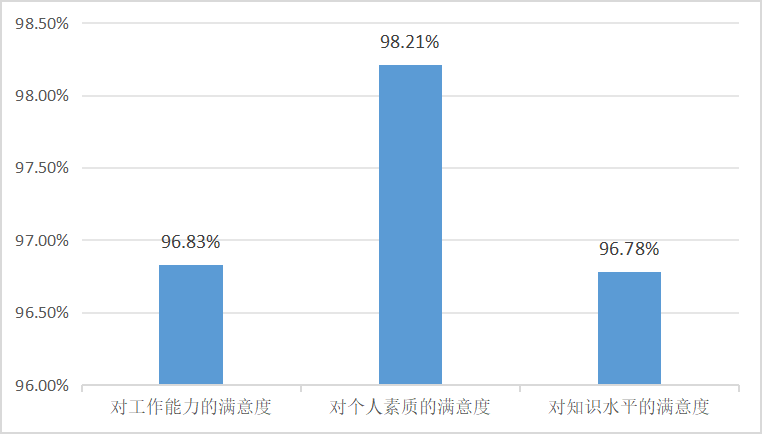 麦可思数据(北京)有限公司主要从工作能力、个人素质、知识水平三个方面向招聘2023届毕业生的用人单位开展问卷调研,问卷调研数据分析显示:用人单位对2023届毕业生工作能力的满意度为96.83%,对2023届毕业生个人素质的满意度为98.21%,对2023届毕业生知识水平的满意度为96.78%(见图2)。