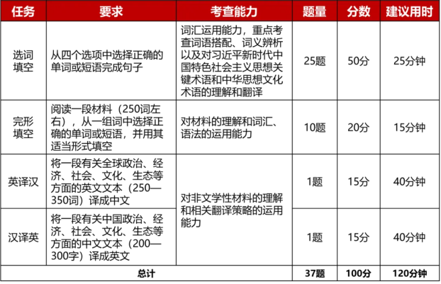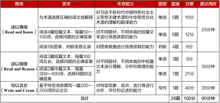 校赛为综合能力赛,考查读写译综合能力,best365校赛参加大赛组委会举办的全国统一线上初赛。线上初赛赛题包括客观题若干道和议论文写作1篇,具体赛题模块见下表。
