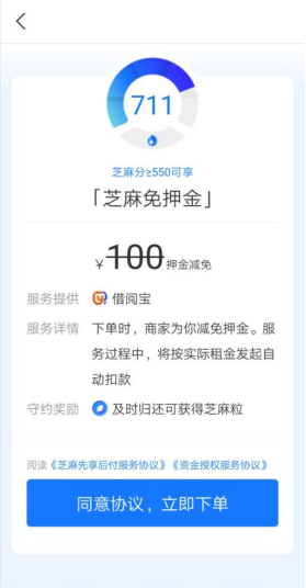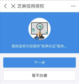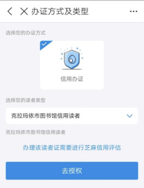 第三步:确认读者类型无误,点击“去授权”,通过芝麻信用授权获得“免押办证”服务,全部完成后即可获得一张证号为身份证的电子借阅证。