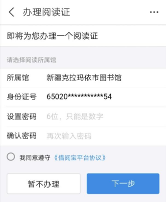 第二步:授权进入后,在办理阅读证界面中,设置6位数密码(6位密码只能是数字),勾选同意遵守协议选项,点击“下一步”